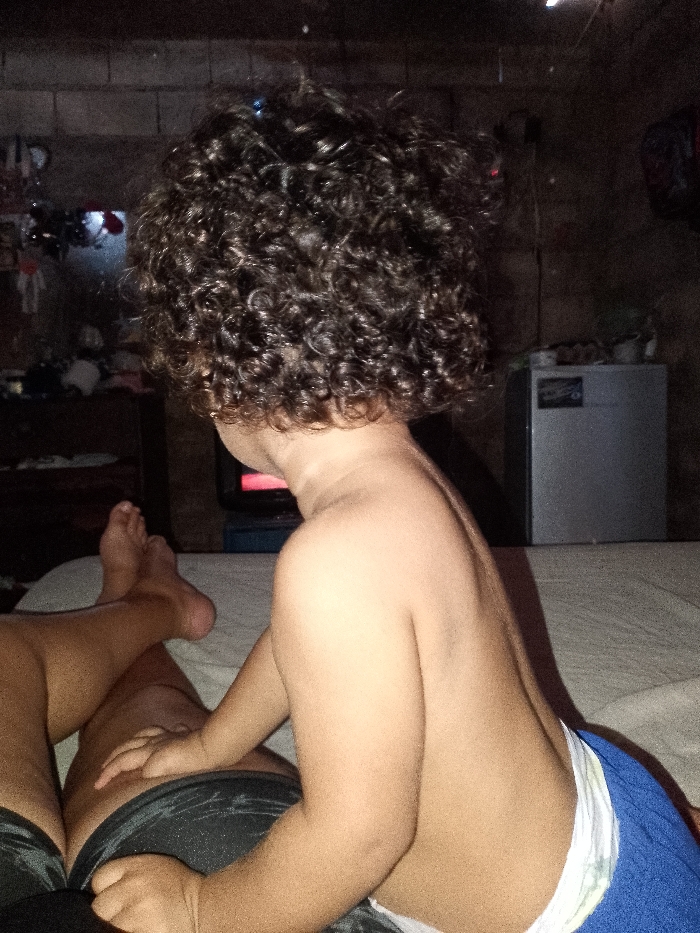 A young child with curly hair sits on a bed, their back and left side visible. They wear a blue diaper with a white trim. An adult leg is in the lower left, clad in dark shorts. Behind the child, a dark room features a television with a red glow, a dresser, and a small silver refrigerator. The scene is dimly lit, creating a contrast between the subjects and the background.