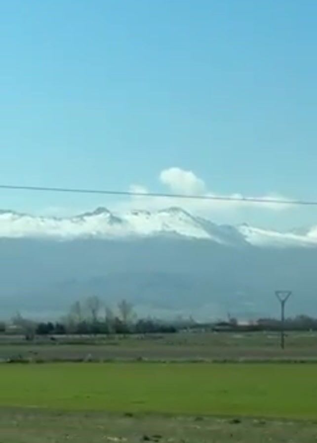 The camera moves along a road, viewing a green field, and in the background are mountains with snow on top. An electric utility pole can be seen from the car window.