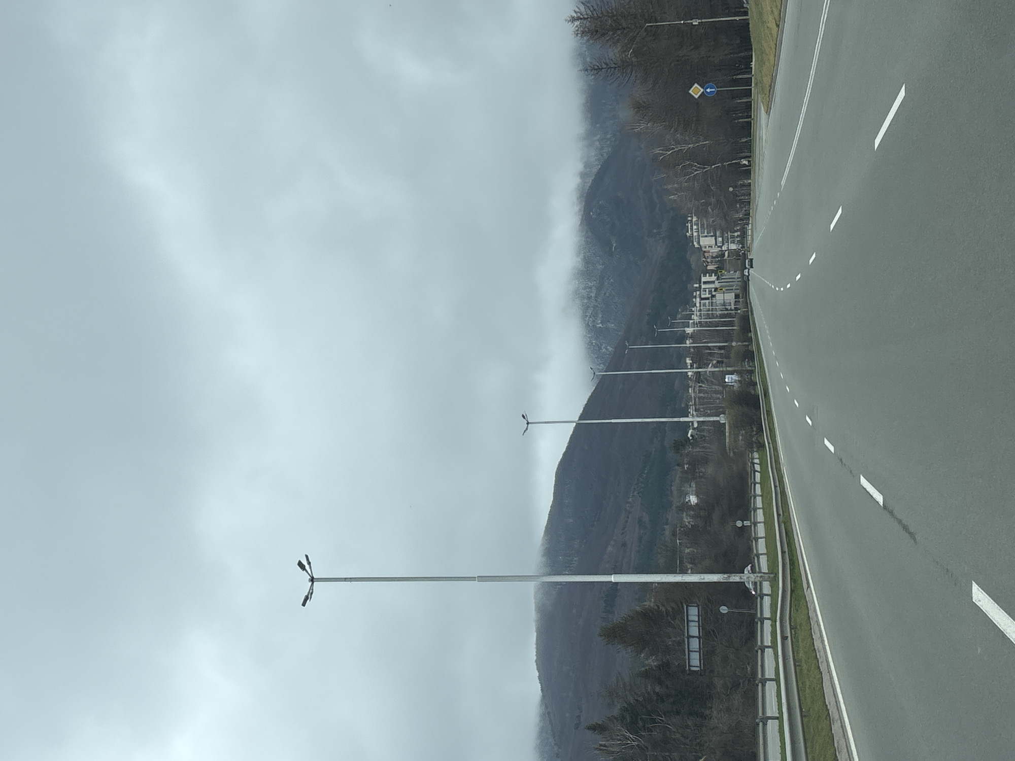 The image depicts a highway bordering a mountain, likely in a mountainous region. The sky is overcast with a gray tone, suggesting cloudy or foggy weather. On the right side of the image, a gray asphalt road with white lane markings is visible. To the left of the road is a metal guardrail and sparse green vegetation, bordering the base of the mountain. Streetlights are evenly spaced along the side of the road. The mountain rises in the background, partially obscured by low-hanging clouds or fog. Some buildings are visible against the side of the mountain. The location is near the city of Sofia, Bulgaria.