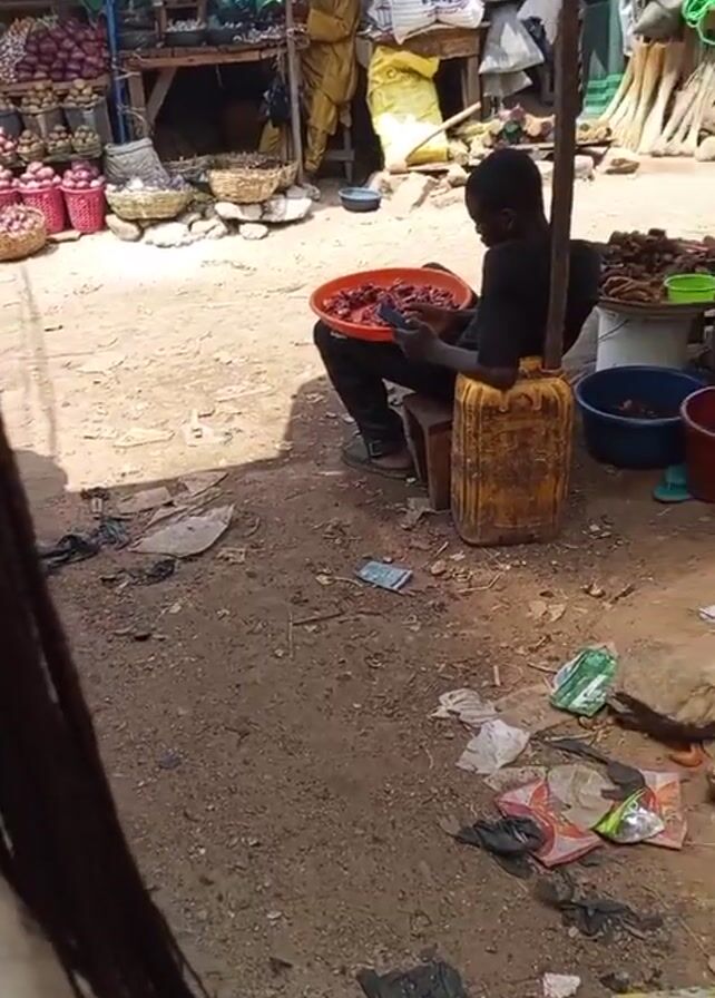 bustling outdoor market. There are several stalls with various items for sale, including onions, baskets, and other goods. A young man sits on a yellow container, using his phone while holding a red tray filled with red objects, possibly meat or some sort of snack. The ground is dirty and littered with trash. The camera moves closer to a meat stall where a man in a black t-shirt is cutting large pieces of raw meat. There are several other people around the stall, and someone is paying with a wad of bills.
