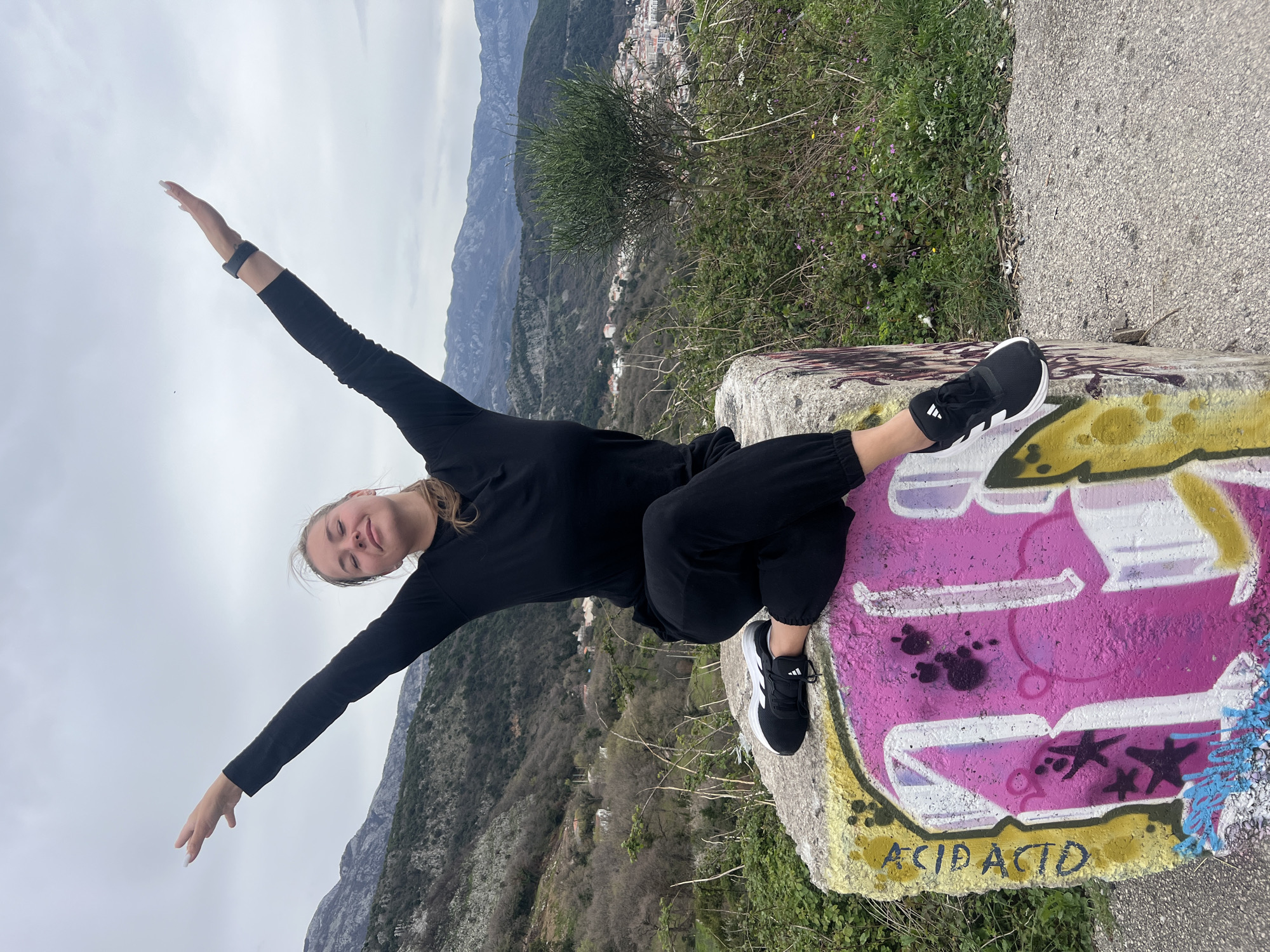 A young woman in black athletic attire, consisting of a long-sleeved top and pants, is seated cross-legged on a concrete block with graffiti. The graffiti is predominantly pink and yellow, with the words "ACID ACTD" written along the bottom edge. The woman is wearing black and white athletic shoes. She has both arms extended outwards, parallel to the ground. The background includes a mountainous landscape with a hazy sky. Vegetation is visible on the hillside, and a partial view of the city of Podostrog, Montenegro, is present in the distance. The photograph appears to have been taken from a slightly elevated position overlooking the landscape.