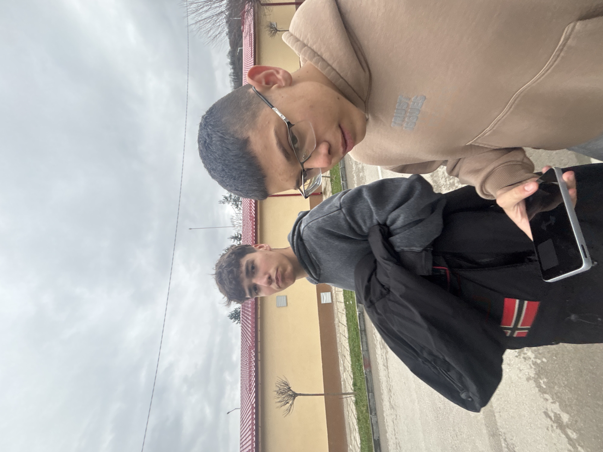 Two young men are standing outside a building, likely in Troyan, Bulgaria