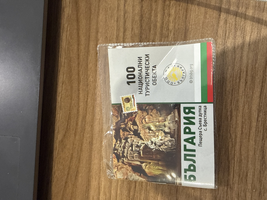 A plastic-wrapped booklet, likely part of the "100 National Tourist Sites" program, rests on a light brown wooden surface with distinct grain. The booklet features a prominent image of the illuminated interior of Saeva Dupka Cave with stalactites and stalagmites. Below the image, the text "БЪЛГАРИЯ" (Bulgaria), "Пещера Съева дупка" (Saeva Dupka Cave), and "с. Брестница" (Brestnitsa village) is displayed. A small stamp-like sticker, also depicting the Saeva Dupka Cave, is affixed to the upper left of the main cave image. To the right, the booklet shows "100 НАЦИОНАЛНИ ТУРИСТИЧЕСКИ ОБЕКТА" (100 National Tourist Sites), a circular logo for the Bulgarian Tourist Union with "@btsbg.org", and a small Bulgarian flag stripe at the bottom. The upper background shows a dark, featureless, matte surface, possibly an electronic device. No individuals or specific actions are depicted. The item, produced by the Bulgarian Tourist Union, suggests a location within Sofia, Bulgaria, possibly at a residence, a tourism-related office, or a retail establishment.