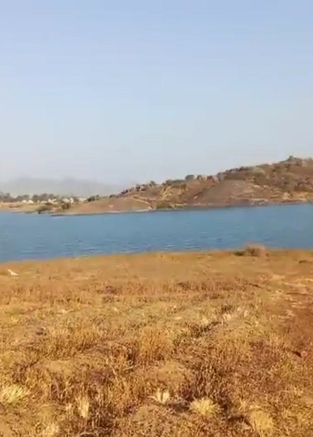 wide shot of a landscape featuring a body of water, likely a lake or dam. In the foreground, there's a field of dry, golden grass. A dirt path leads towards the water's edge. Two individuals are visible near the shoreline, one walking towards the water and the other is seated. In the background, there are rocky hills and a distant shoreline with trees and some structures that suggest a village or town. The sky is clear and blue. The video is labeled as Lamingo Dam in Jos, Nigeria, Plateau State.
