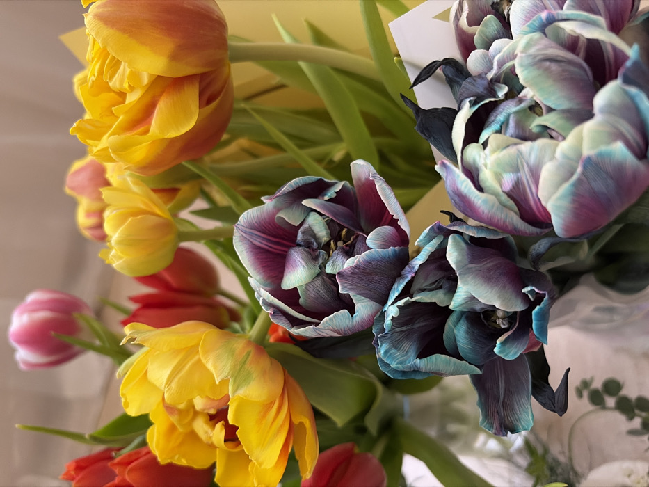 The image presents a close-up, static, indoor view of a dense floral arrangement, purportedly located in Varna, Bulgaria. The primary subjects are multiple bouquets of tulips, with varied colors and forms. In the foreground and extending to the lower right, several open, ruffled tulips display a complex coloration of deep purple, teal-blue, and light lavender-pink on their petals. Some of these petals show minor darkening or drying at their edges. In the mid-ground and upper left, multiple bright yellow tulips, some exhibiting orange-red streaks, are visible, appearing to be double-flowered varieties. Interspersed among these are solid red tulips. A single pink and white variegated tulip is present in the soft-focused upper background. Green stems and foliage are prominent throughout the floral cluster. The flowers are likely arranged in unseen clear glass vases. The background is an indistinct, softly lit blend of muted beige and light yellow tones, indicative of an interior setting. No individuals or specific actions are depicted.