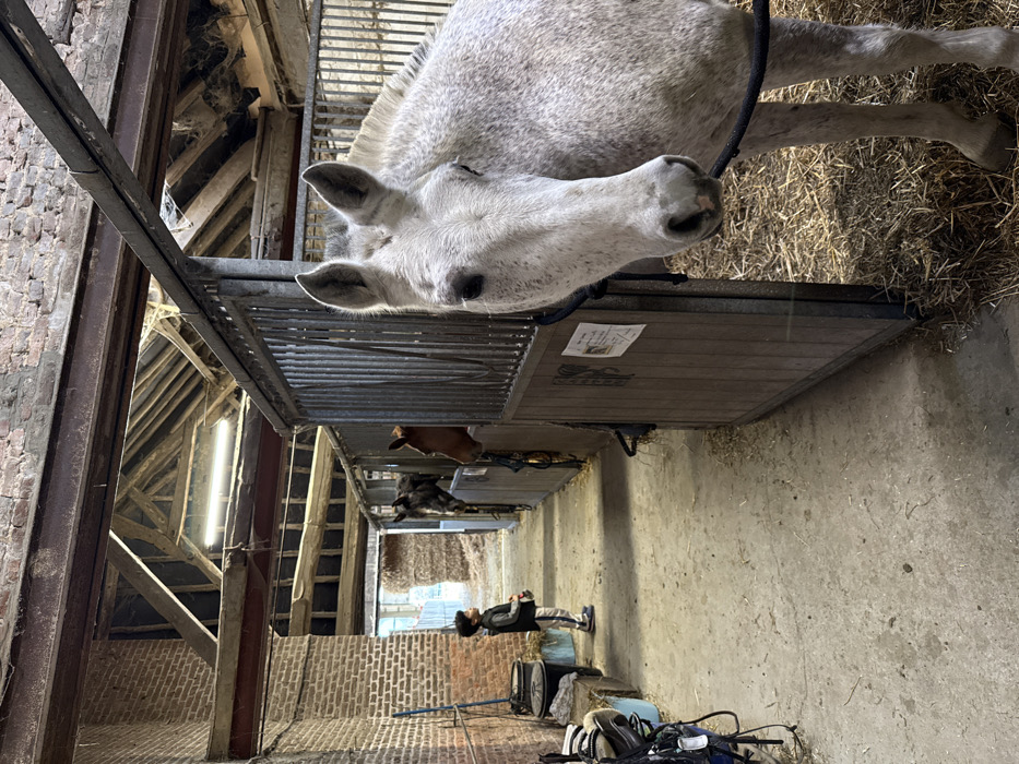 The image displays the interior of a stable or barn, located in Estaimpuis, Belgium