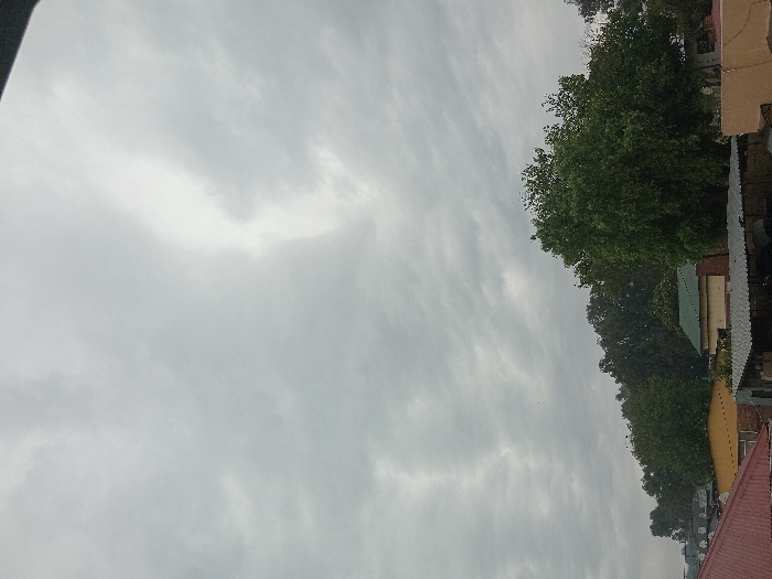 An overcast sky dominates the view, filled with layers of gray clouds. Below the clouds, a row of trees with lush green foliage lines the horizon. Patches of building roofs with varying colors like yellow and red appear beneath the trees. The image is rotated and the horizon is vertical, with the sky taking up the majority of the frame.