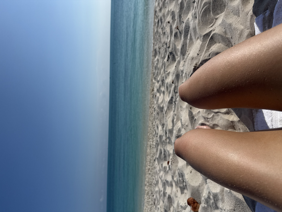 The scene depicts a first-person view from a supine position on a beach in Key West, United States of America. In the immediate foreground, two tanned human legs, extending from the bottom center, rest on a white towel, with the feet partially obscured. The midground consists of a light-colored, rippled sandy beach, exhibiting shadows and texture. A small, irregularly shaped, reddish-brown organic object is present on the sand in the lower left quadrant. The sand transitions into clear, calm turquoise ocean water, which extends to a distinct horizon line. The water displays a gradient from lighter near the shore to deeper blue further out. The background consists of a clear, bright blue sky, with a faint lighter band visible just above the horizon. Direct sunlight illuminates the scene, casting subtle shadows on the sand and highlighting the skin.