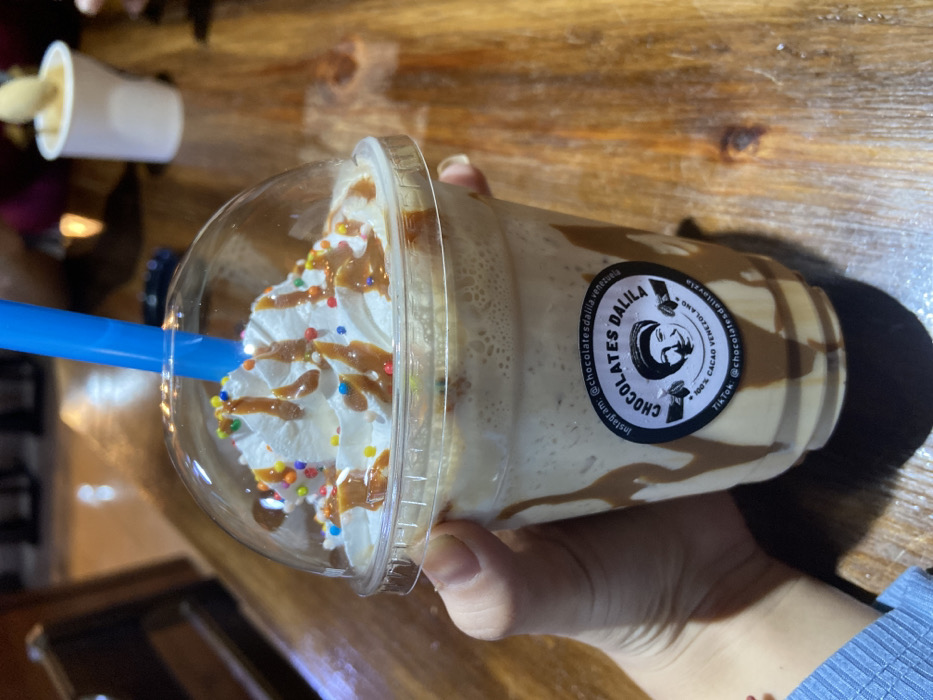 A left hand holds a clear plastic cup containing a light-beige blended beverage. The cup is adorned with internal streaks of dark brown syrup and features a black circular label with "CHOCOLATES DALILA," "100% CACAO VENEZOLANO," and social media handles (@chocolatesdalila.venezuela, @chocolatesdalilavzla), along with a stylized graphic of a face. The beverage is topped with white whipped cream, caramel drizzles, and multicolored sprinkles, covered by a clear dome lid with a bright blue plastic straw inserted. A portion of a blue sleeve is visible on the wrist of the person holding the cup. The immediate environment consists of a textured wooden table surface. In the blurred background, a white paper cup containing a light-colored item with a small stick or spoon is visible to the right, and dark wooden furniture elements are to the left, indicating an indoor setting like a cafe in Juan Griego, Venezuela.