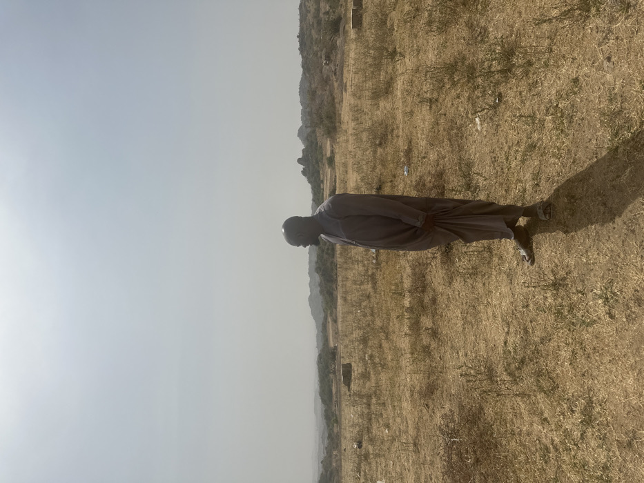 A single adult male stands in a dry, open field under a hazy, bright sky in an undeveloped area of Jos, Nigeria