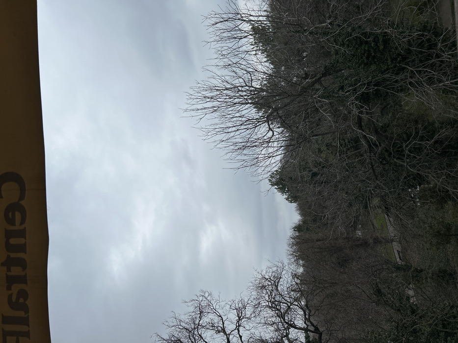 The image presents an elevated, static view of a park or wooded area in Silistra, Bulgaria, under a uniformly overcast, light grey sky. A blurry, yellow-orange horizontal band occupies the top segment of the frame, displaying inverted, dark brown Cyrillic characters that spell "ЦЕНТРАЛ" (CENTRAL). The majority of the scene below the horizon is filled with a dense canopy of trees. Predominantly, these are bare deciduous trees, their intricate, dark branches silhouetted against the lighter sky and distant foliage, suggesting a winter or early spring season. Interspersed among these are evergreen trees, visible as darker green patches. Several tree trunks and branches, particularly on the right side, are heavily covered in dark green ivy. Through the lower-middle portion of the tree line, a winding, paved path is discernible, with patches of bare ground or short grass. A dark-colored park bench is visible adjacent to this path. No individuals, animals, or observable activities are present in the scene. The lighting is diffuse and natural, consistent with the cloudy atmospheric conditions.