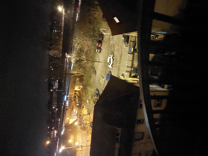 A night view from a high vantage point shows a street and parking lot. Several cars are visible, including a white one prominently parked in the lot. Streetlights illuminate the scene. In the foreground, a blurry structure partially obscures the view, likely a building or balcony feature. The overall impression is of an urban setting after dark, with a combination of natural darkness and artificial light.