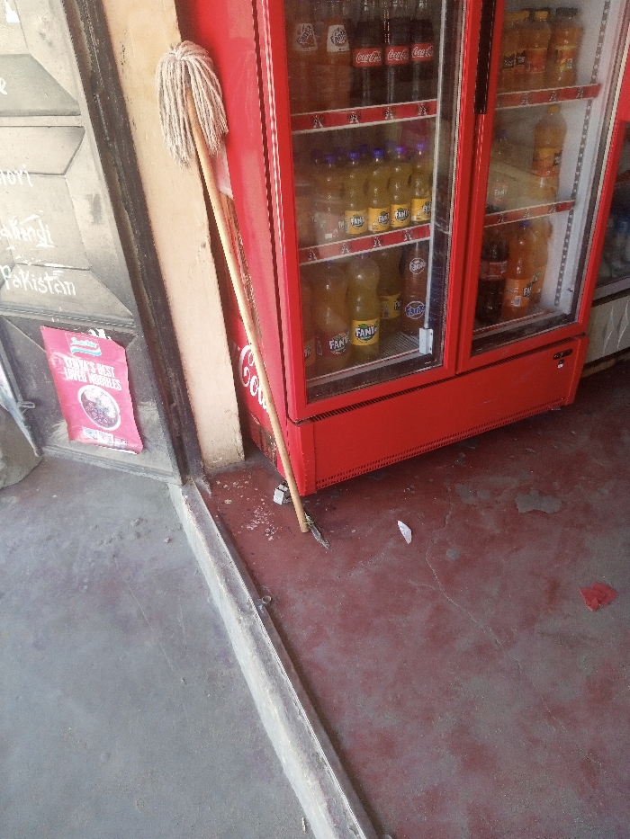 The scene depicts a static, semi-outdoor commercial area in Mtopanga ward, Kenya, likely a shop entrance. A tall, red, double-door glass-front display refrigerator dominates the right side, stocked with multiple shelves of bottled beverages, including Coca-Cola and Fanta. To the left of the refrigerator, a light-colored wooden-handled string mop leans against a beige wall or pillar. The floor is segmented: grey concrete on the left, separated by a low concrete threshold from a worn, reddish-painted concrete area on the right, which contains scattered debris including white paper scraps. Further to the left, a grey, possibly metal, building surface or door features faint white markings, including partial words such as "mori," "hindu," and "Pakistan." A red, vertically oriented poster advertising "KENYA'S BEST LOVED NOODLES" with an image of a noodle bowl is affixed to this grey surface. No individuals are present.