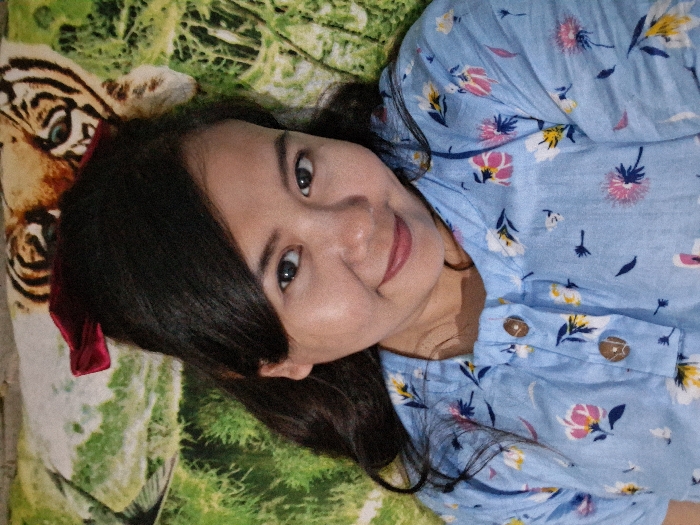 A woman with dark hair and light skin lies on a patterned blanket, looking directly at the camera. The blanket features a tiger design with green foliage. She wears a blue blouse with a floral pattern and three buttons. Her head is angled slightly to the right, and a dark red bow is partially visible in her hair near the tiger's head on the blanket.