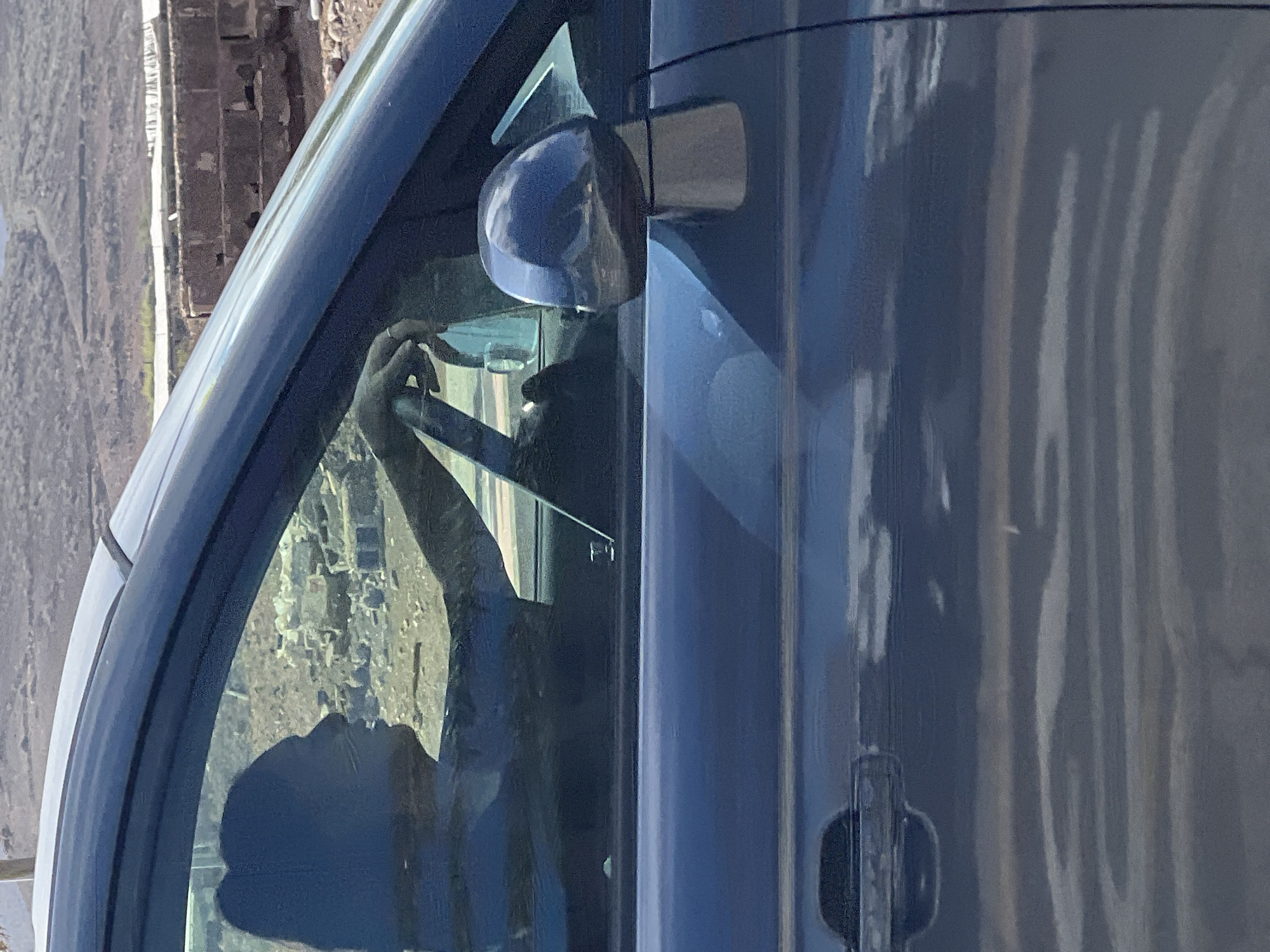 The image displays a dark-colored vehicle, likely a car, parked outdoors in daylight within Santa Lucía de Tirajana, Spain. The photograph captures the front passenger side of the car, with a significant portion of the driver visible in silhouette through the driver's window. The driver, whose profile and pulled-back hair are discernible, is seated behind the steering wheel, with their right hand, wearing a ring, grasping the wheel. The vehicle's exterior paint appears to be a dark blue or black, showing reflections of the surrounding environment. A side mirror is visible on the driver's side, and a door handle is present on the passenger side door. In the background, beyond the vehicle and visible through its windows, are arid, terraced hills or mountains indicative of a volcanic landscape. Closer to the vehicle, behind it, are structures made of concrete or cinder blocks, appearing to be in a state of disrepair or part of an abandoned site.