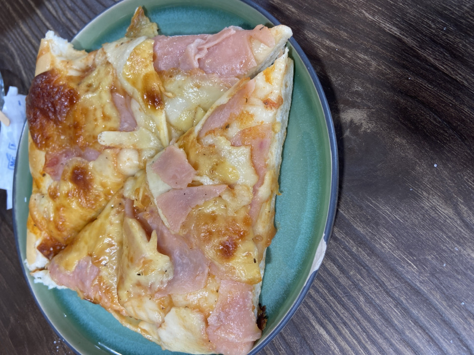 - "A round, teal-colored ceramic plate with a dark rim holds four slices of ham and cheese pizza" by FM-49R4h1, licensed under CC BY 4.0
