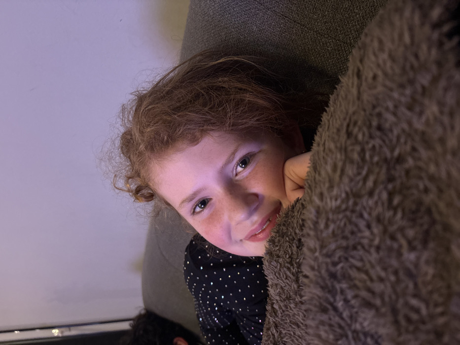 A young girl with red hair and freckles gazes upward with a slight smile. She rests her head on her hand, partially obscured by a fuzzy brown blanket. She wears a black top adorned with small silver dots. She seems to be lying down, with the head of another person visible in the bottom left corner. A white wall fills the upper left of the frame, contrasting with the darker hues surrounding the girl.