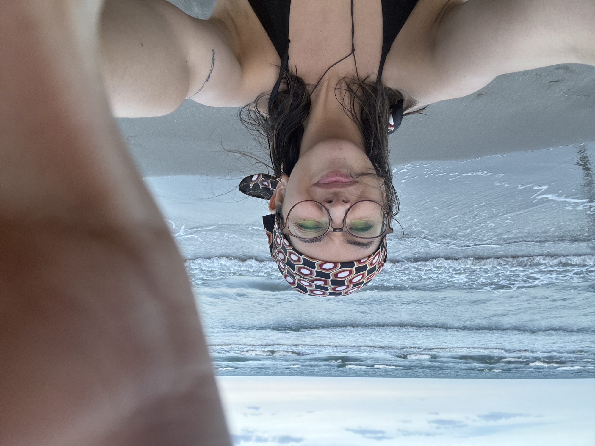 person on a beach, likely in Mata de Uva, Mexico, taking a selfie. The person is wearing a black bathing suit and a patterned headscarf. They also have glasses and appear to have a tattoo on their arm. The background includes the ocean and the sky. The person is facing downward and their arm is partially covering the lens.