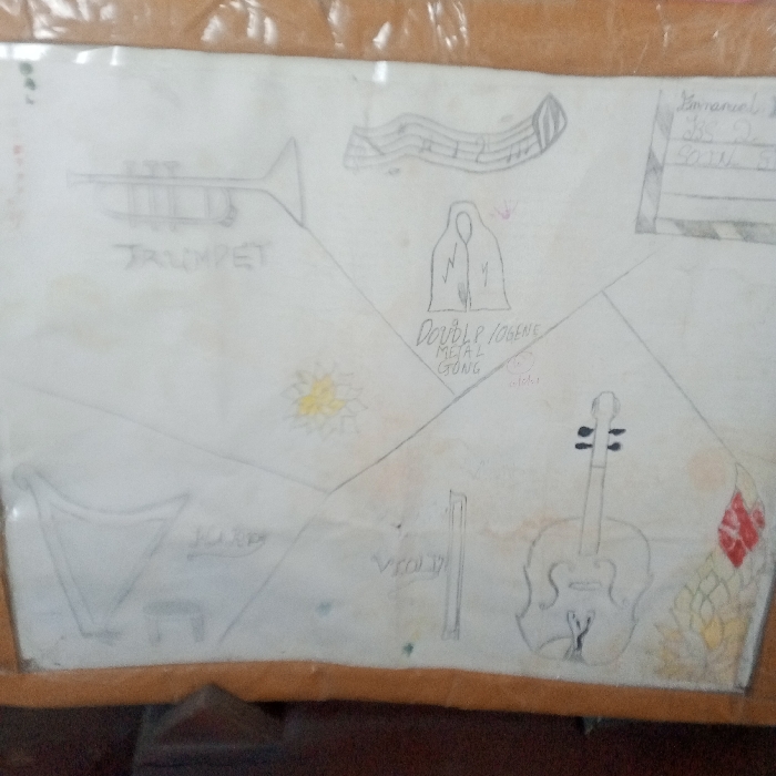 A rectangular piece of aged, off-white paper, protected by a clear, wrinkled plastic film and secured by brown adhesive tape to a dark brown surface, displays multiple pencil drawings with minimal color. The paper exhibits creases, smudges, and discoloration. The artwork is sectioned by faint pencil lines. In the upper left quadrant, a trumpet is sketched, labeled "TRUMPET." Above the center, a wavy musical staff with notes is drawn. To its upper right, a rectangular frame resembling a clapperboard contains "Emmanuel D," "CLASS 2," and "GOOD STUDENT." Below the musical staff, a simplified, cloaked figure is depicted, labeled with "DOUBLE IOGENE METAL GONG" (text partially obscured/faded), alongside a small pink mark. A yellow starburst design is positioned mid-left. The lower left features a harp and a small rectangular object, with "HARP" written nearby. The lower right quadrant contains a violin and its bow, labeled "VIOLIN," beside a geometric pattern incorporating red, green, and yellow elements. The image captures a static display of student artwork. This scene is located in Animashawun, Nigeria.