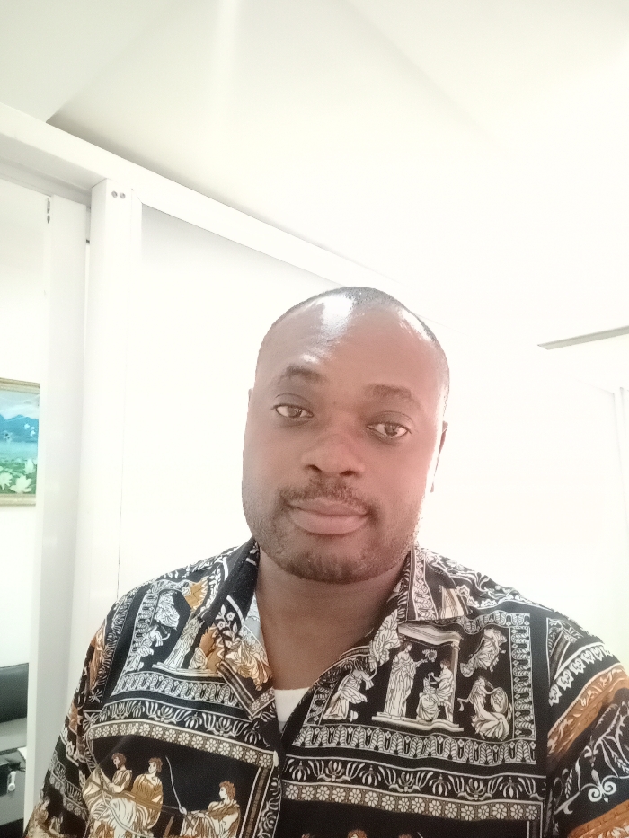A frontal, chest-up image captures an adult male in an indoor setting within the city of Gwarinpa, Nigeria