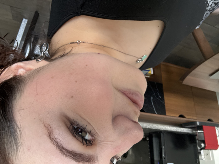 A close-up image captures a person's face from a low angle, focusing on their left eye and the left side of their face. They have fair skin, dark eyebrows, and dark eyelashes. A silver necklace with a light blue or green pendant rests on their neck. The background includes a black shirt and a glimpse of interior elements like a wooden cabinet with a black marble countertop. There is also a glimpse of a silver chair and various items such as an espresso machine.