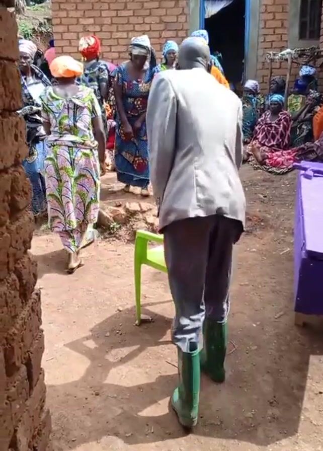 The video depicts a group of people gathered outside a brick building. Most of the people are women, dressed in colorful patterned garments, and some are wearing head coverings. They are either standing or sitting on the ground. A man in a light-colored suit and green rubber boots walks towards the group. He passes by a green plastic chair with a red bucket on it. In the background, there's a purple chest-like object. The ground is dirt. The scene seems to take place in a rural or village setting. The purpose of the gathering is unclear, but it appears to be a social event. The individuals are dressed in their finest clothing. A song, possibly of a religious nature, can be heard in the background.