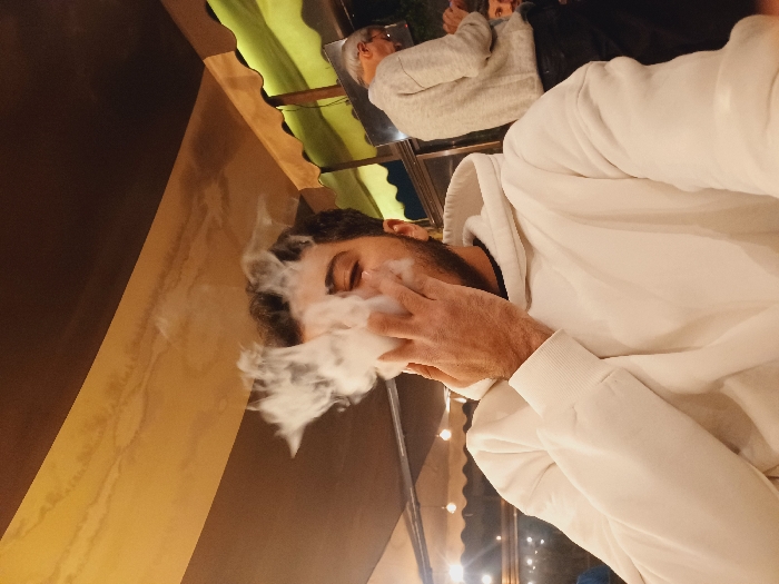 A man wearing a white hooded sweatshirt sits indoors, exhaling a large cloud of vapor that envelops his face. His eyes are closed. An older man wearing a gray sweater sits further back at what seems to be an outdoor cafe. Behind the vapor cloud is a decorative, vertically-striped wall. The atmosphere appears relaxed and casual, illuminated by the ambient light.