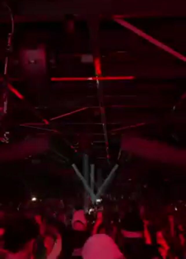 interior of a nightclub or large event space packed with people. Above the crowd is a complex ceiling structure featuring angular, glowing white panels, alternating with dark spaces. Red lighting strips and spotlights are also visible. The camera appears to be held by someone in the crowd, filming upward. The crowd appears to be moving and energetic, likely dancing to music. The overall atmosphere is dark and energetic.