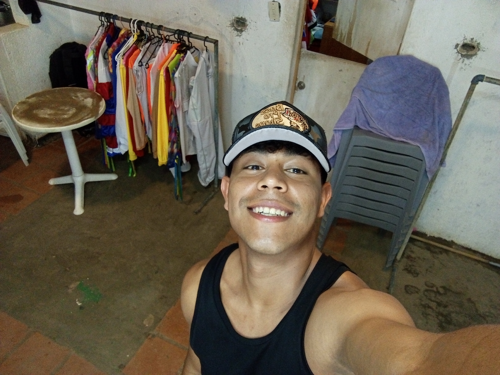 A selfie of a man with brown skin, wearing a black tank top and a camouflage baseball cap with a white brim. The man is smiling. The background includes a clothing rack with colorful garments on hangers, a small round table, and a gray plastic chair draped with a purple towel. The room is in Porlamar, Venezuela. The walls are white and show signs of wear. The floor appears to be a combination of tile and concrete.