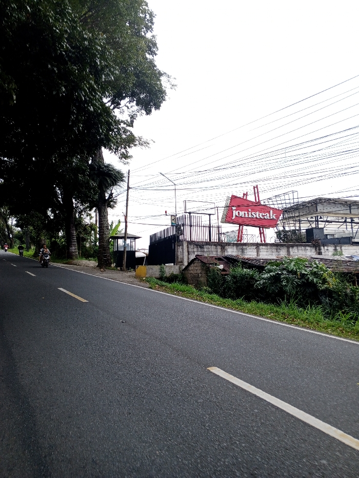 The image displays an asphalt road in Multhan, India, under an overcast, light grey sky. The road, which appears to gently curve or ascend to the left, features a white dashed lane marking on its left side and a solid white line delineating the right shoulder. In the distant left lane, two motorcycles are observed moving away from the viewer; the closer motorcycle carries two occupants, while the one further ahead has a single occupant. To the right of the road, a strip of overgrown green vegetation and grass precedes a low, weathered concrete wall. Behind this wall, a small, partially obscured structure constructed from brick or stone with a dark roof is visible, surrounded by dense foliage. Further along this side, a large red sign with white capitalized lettering spelling "Jonisteak" is prominently displayed on a visible metal frame, suggesting a commercial establishment. Behind this sign, a dark metal fence or gate and a building with a flat roof are present. Several utility poles support numerous overhead power lines that crisscross the upper right portion of the frame. A small, dark booth-like building with a light-colored roof is situated behind a yellow structure near one of the utility poles. The left side of the scene is characterized by a dense, dark green canopy of mature trees, with visible tree trunks along an unpaved roadside.