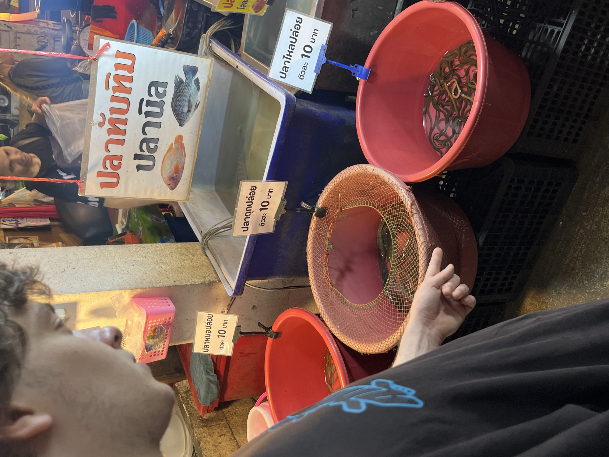 In an indoor market stall within Samrong Nuea Subdistrict Municipality, Thailand, a partial view of a male individual, seen from the right side of his head and torso, dominates the left foreground. He has light skin and short, curly brown hair, and wears a dark t-shirt with a light blue graphic. His gaze is directed downwards and to the right, towards a collection of containers holding live aquatic animals. His right hand is partially visible, extended slightly with fingers curled, pointing towards a red net basket. The scene features several containers at varying levels, primarily red and blue, resting on black plastic crates or the ground. * To the immediate right of the foreground individual is a red plastic bucket containing numerous small, live fish, likely Climbing Perch. A white sign attached to its rim displays Thai text "ปลาหมอปล่อย ตัวละ 10 บาท" (Climbing Perch for release, 10 baht each). * Adjacent to this, centrally placed, is a red net basket containing several live, dark-colored fish, consistent with Catfish. A similar sign, "ปลาดุกปล่อย ตัวละ 10 บาท" (Catfish for release, 10 baht each), is affixed to its edge. * Further right, a red plastic bucket holds multiple long, slender, dark-colored aquatic animals, identified as Ricefield Eels. A sign reads "ปลาไหลปล่อย ตัวละ 10 บาท" (Ricefield Eel for release, 10 baht each). * Behind these smaller containers, a large, rectangular blue plastic tub filled with water contains larger fish. A prominent white sign, suspended above this tub, displays images of a reddish fish (Ruby Tilapia) and a dark fish (Nile Tilapia), with the Thai text "ปลาทับทิม ปลานิล". In the background, two individuals are visible. One person, positioned behind the blue tub, looks towards the camera while holding a clear plastic bag. Another person is partially obscured behind them. Market elements, including an industrial scale and various other items, are discernable. A pink plastic basket holding clear plastic bags hangs on a concrete pillar to the left. The overall lighting suggests an indoor or covered market setting.