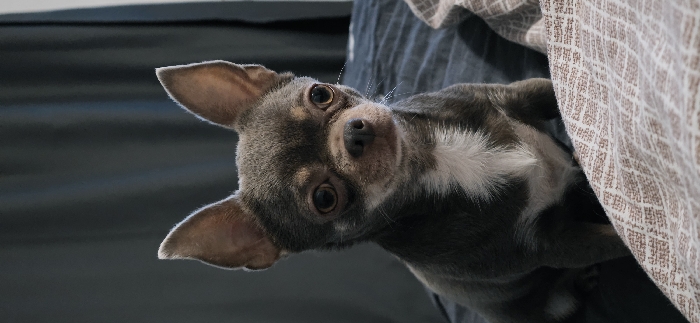 A small Chihuahua dog with gray fur and a white patch on its chest peers curiously into the camera. The dog's ears are large and upright, and its eyes are wide and alert. The dog is lying on a patterned blanket near a dark surface, possibly a bed. The dog's head is tilted slightly, giving it a playful and inquisitive expression.