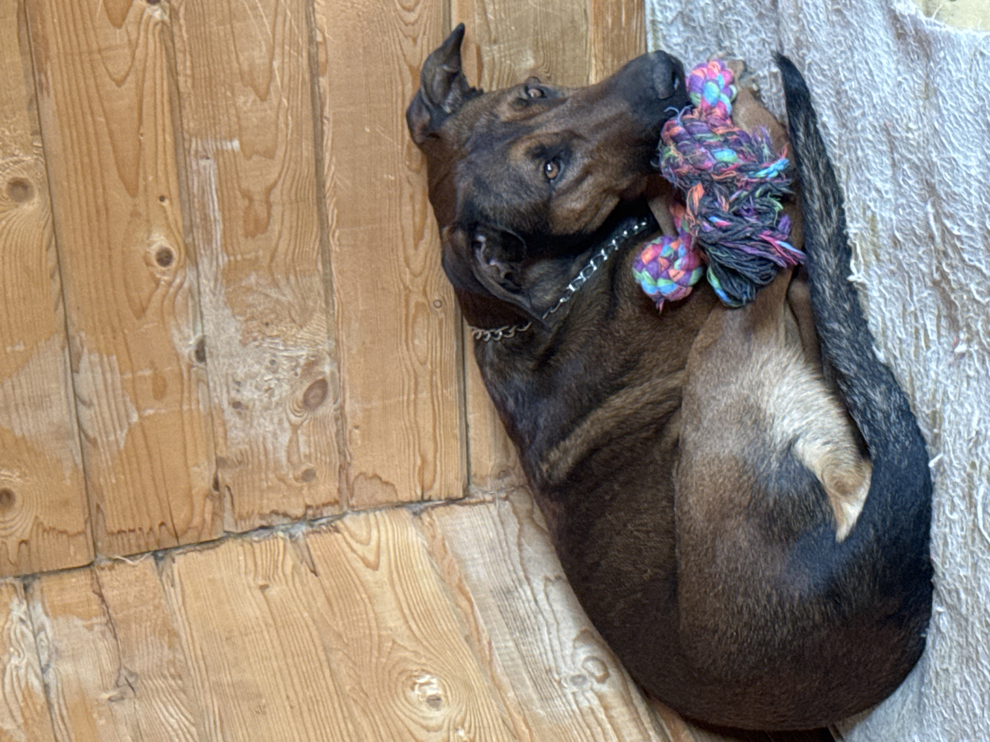 A tan-and-black dog with a chain collar is lying on a light-colored rug placed on a wooden floor. The dog is curled up, facing upwards and towards the left of the frame. The dog is holding a colorful, braided toy in its mouth. The wooden floor is made up of light-colored planks with visible wood grain and knots.