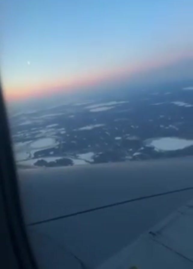 The view from an airplane window shows the wing of the plane against a backdrop of a landscape dotted with snow-covered fields and bodies of water. The sky is a gradient of colors, transitioning from blue to pink. The camera slightly pans to the right, providing a broader view of the landscape below.