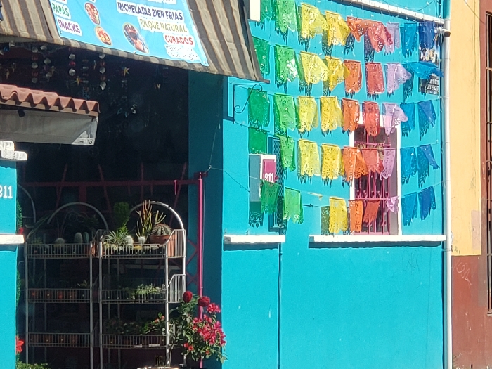 - "A vibrant blue building is adorned with strings of colorful papel picado" by FM-zKXAq1, licensed under CC BY 4.0
