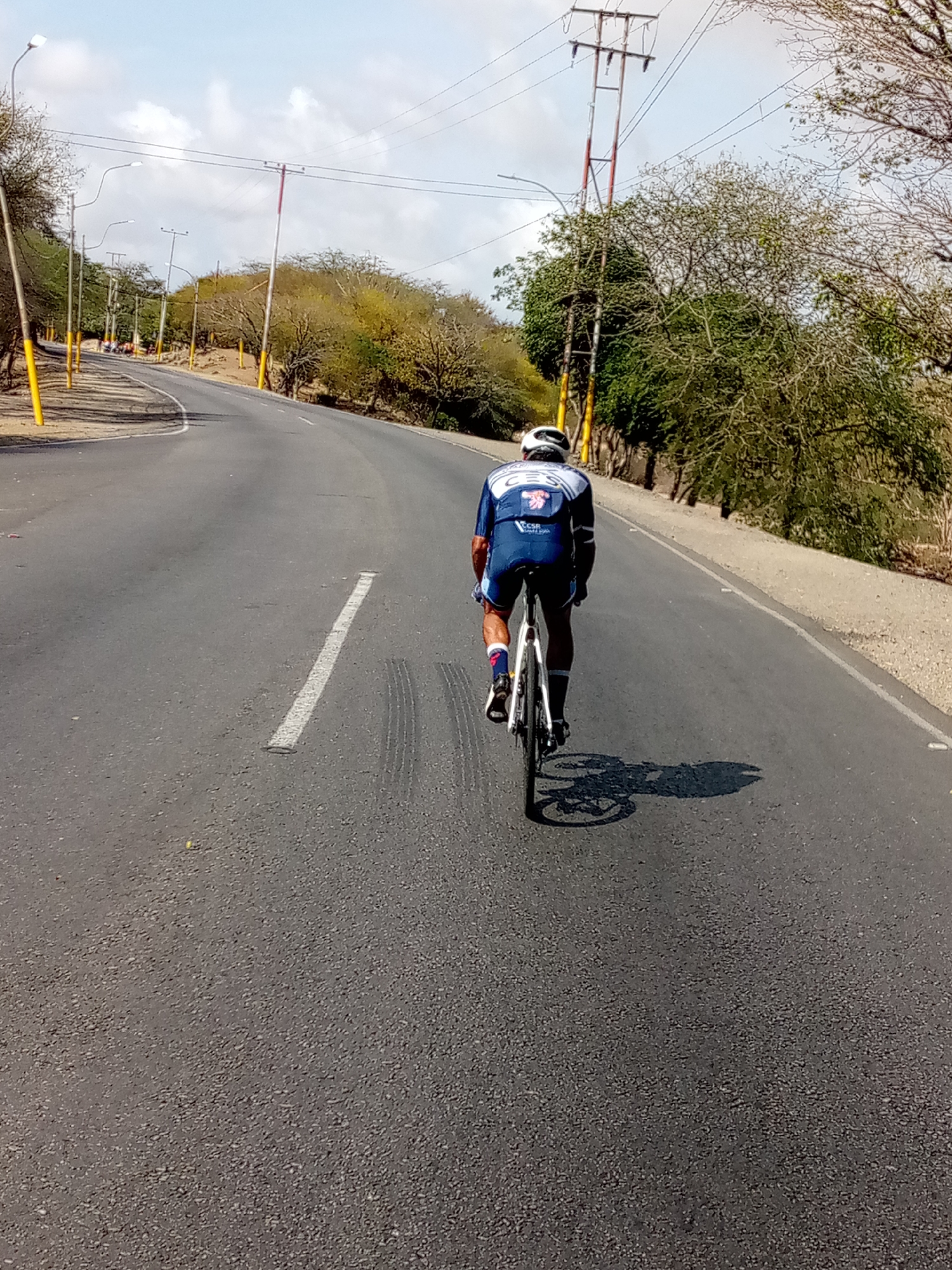 A man is riding a bicycle on an asphalt road. The road is in a rural area, as evidenced by the trees and vegetation on either side. The man is wearing a blue cycling jersey and a white helmet. He is riding away from the camera and uphill. There are white lines on the road and a set of tire marks. In the background, utility poles and wires line the road. The city is San Juan Bautista, Venezuela.