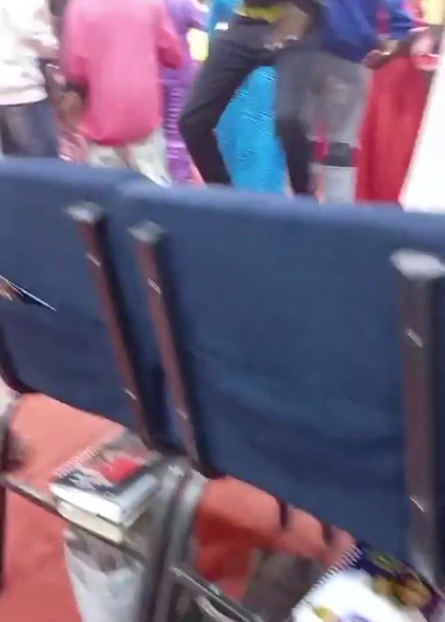 group of people, mostly men, dancing and celebrating in a room with red carpet and blue chairs. The room appears to be a church or large meeting hall with a decorated ceiling and visible speakers. The people are wearing casual clothing, and some are raising their arms in the air, expressing joy and excitement. The camera moves erratically, capturing different angles of the scene.