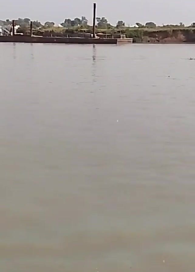 body of water with a large barge in the distance. The barge has what appears to be construction equipment on it, including tall poles and a crane. The shoreline is visible in the background with trees and some buildings. The water is calm with a slight rippling effect.