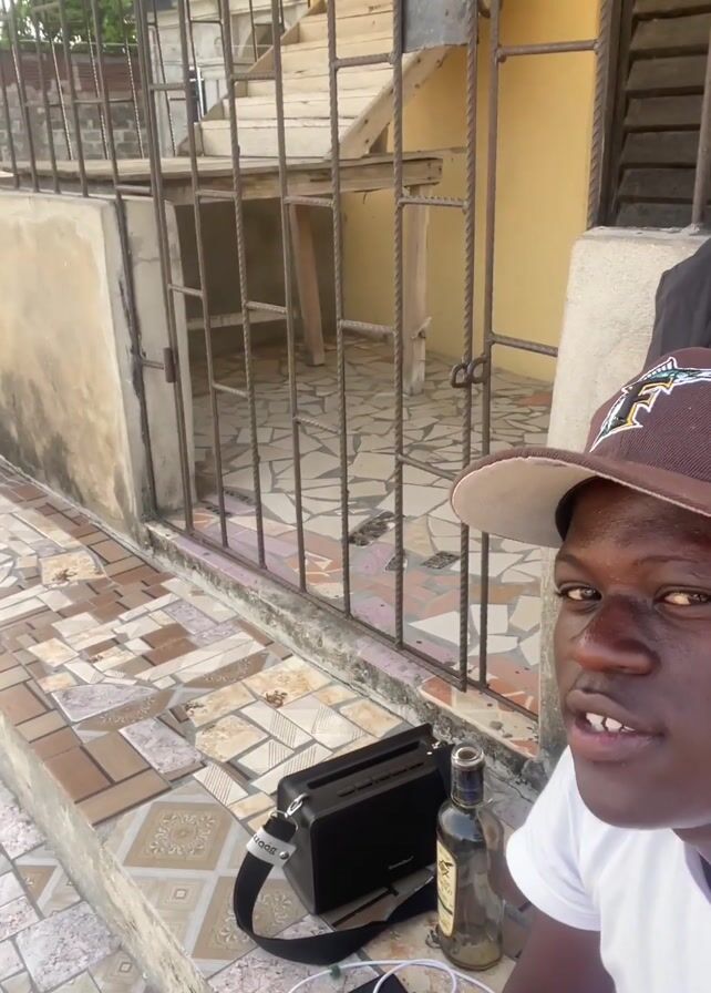 A young man is recording a selfie video outdoors. He is wearing a white t-shirt and a brown baseball cap with a white "F" logo on it. He appears to be sitting on a tiled patio. Behind him is a metal gate leading to an open stairwell. To his left are a small black speaker with a shoulder strap, a nearly empty bottle of "Santo Domingo" rum, and a pink charger connected to a black device. A black jacket is hanging on a pillar next to him. He looks directly at the camera while speaking, occasionally nodding his head. The overall lighting suggests it's daytime.