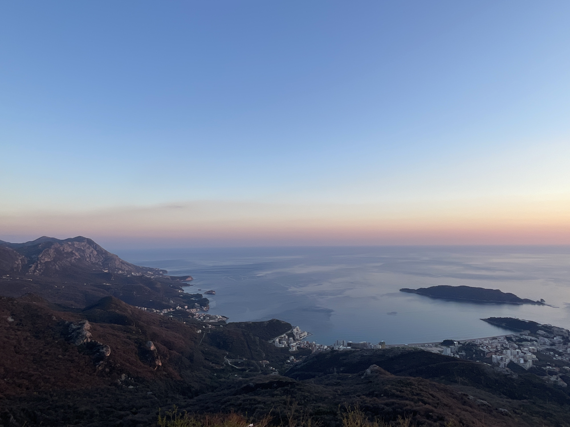An aerial view captures the Brajici, Montenegro landscape at dusk