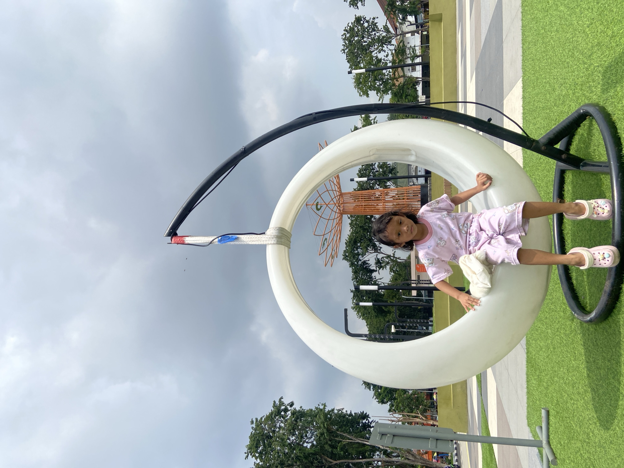 The image depicts an outdoor public recreational area in the city of Sidoarjo, Indonesia, under an overcast sky. A young child, appearing female, is seated centrally on a large, white, crescent-shaped swing suspended from a black metal support frame. The child is wearing a light pink short-sleeved top and matching shorts with patterned designs, and light pink clogs. A small white pouch is positioned on the swing beside the child's left hand. The immediate ground around the swing is covered in artificial green turf. Beyond the turf, paved walkways in shades of grey and dark grey with geometric patterns are visible. The background features lush green trees, several modern light poles, and an distinctive orange, lattice-patterned, conical structure, possibly a public art installation or shading element, surrounded by outdoor fitness equipment. White buildings with brown roofs are partially visible in the far background among the trees. A vertical pole with red and white banding and attached wiring secured with blue tape is present in the upper right corner of the frame. The child is looking directly towards the camera with a neutral expression.