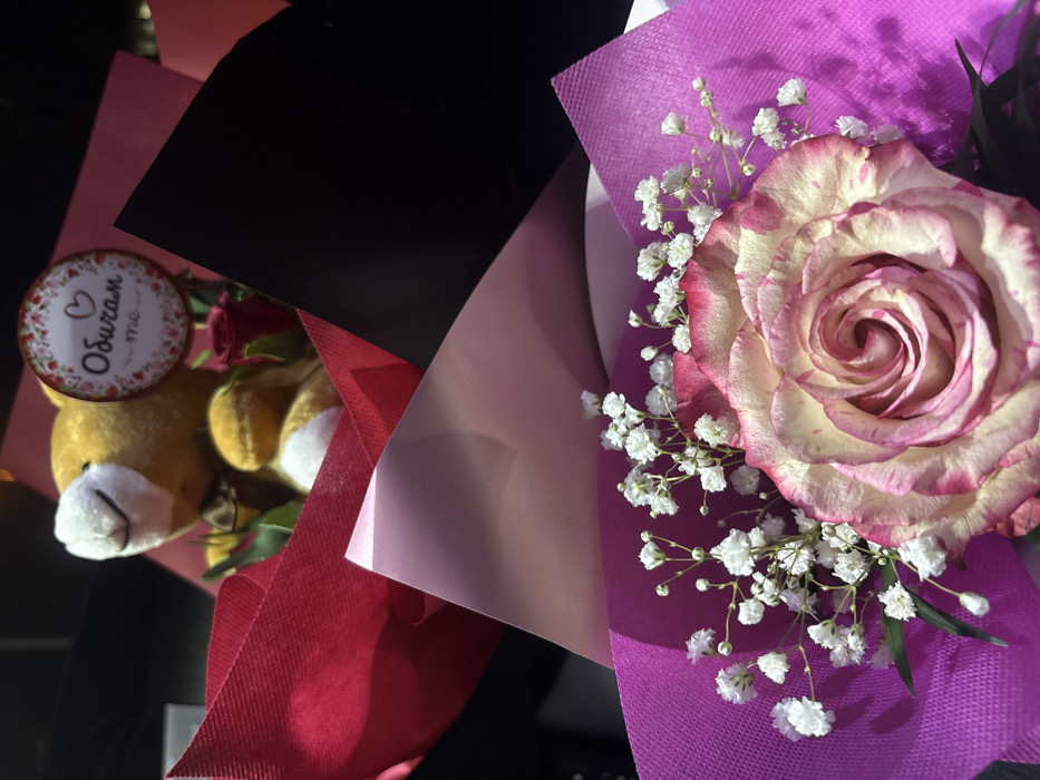 The image displays a close-up, top-down view of two distinct gift arrangements, positioned within a dimly lit interior. In the foreground, a bouquet features a prominent, partially opened rose with variegated white and deep pink petals, surrounded by multiple stems of small white florets (Gypsophila). This bouquet is wrapped in a crinkled magenta non-woven material. Positioned behind and slightly above, a second arrangement contains a small, light brown plush toy, consistent with a bear, featuring white accents on its snout and chest, and a dark bow tie. A single red rose is visible beside the plush toy. An oval-shaped decorative pick, white with a red floral border and a small heart icon, is inserted into this arrangement, bearing the Cyrillic text "Обичам" (Love) above the smaller English word "me." This second arrangement is encased in red non-woven wrapping, with additional layers of light pink and black wrapping material visible between the two primary subjects. No individuals are present, and no specific landmarks or environmental details are discernible to identify a precise location within Targovishte, Bulgaria.