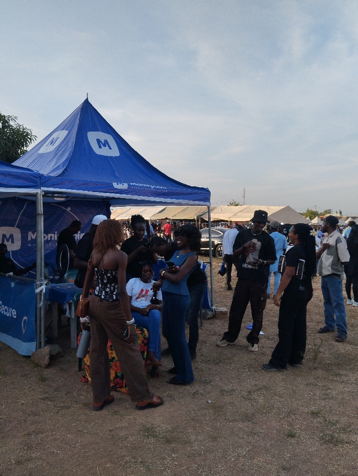 This image captures an outdoor gathering in Rigasa, Nigeria, under a partly cloudy daytime sky. In the foreground to the left, a blue pyramidal tent, branded with prominent 'M' logos and "MoneyPoint" text, is erected over a table and a panel displaying "Secure." Approximately ten individuals are visible in the central and right portions of the frame, standing on dry, light brown earth with sparse vegetation. A woman in a black and white patterned corset-style top and brown wide-leg trousers stands with her back largely to the viewer, holding a small brown shoulder bag. Adjacent to her, a woman in a white t-shirt and blue jeans sits on a chair draped with colorful floral fabric. To their right, a woman with dark hair stands with her arms crossed, wearing a dark blue sleeveless top and dark blue jeans. Further right, a man in a black bucket hat, a black graphic t-shirt, and dark trousers is visible. Another woman, dressed in a black t-shirt and dark trousers, stands nearby with a dark object clipped to her side. The background features multiple white or light-colored tents and partially visible vehicles, indicating a larger event or marketplace.