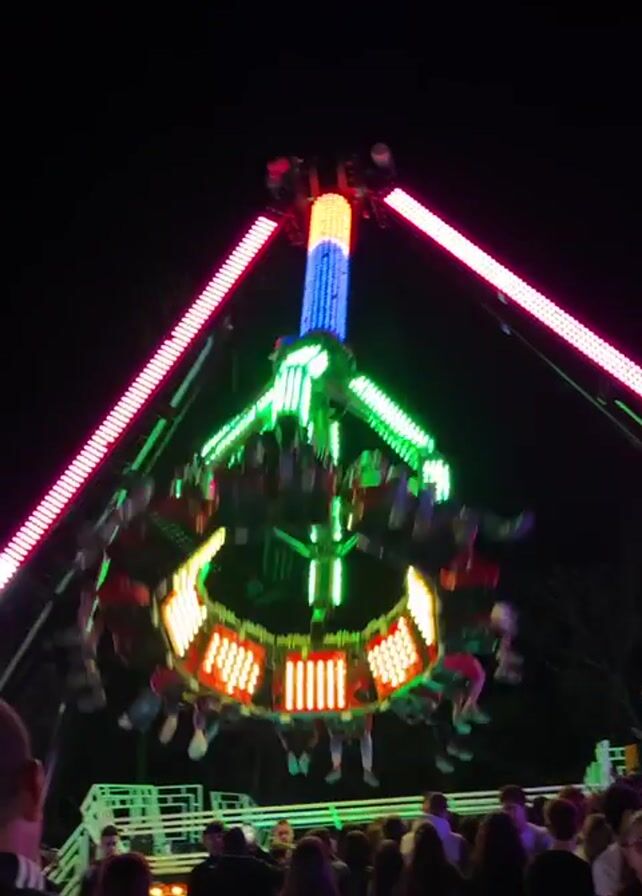 brightly lit spinning carnival ride at night. The ride features two arms with LED lights on them that move the circular passenger holding area up and down, while the center area of the ride also spins. People can be seen in the passenger holding area, with the ride making multiple rotations. Below the ride is a crowd of people looking up at it. The background is dark, showing some trees silhouetted against the night sky.