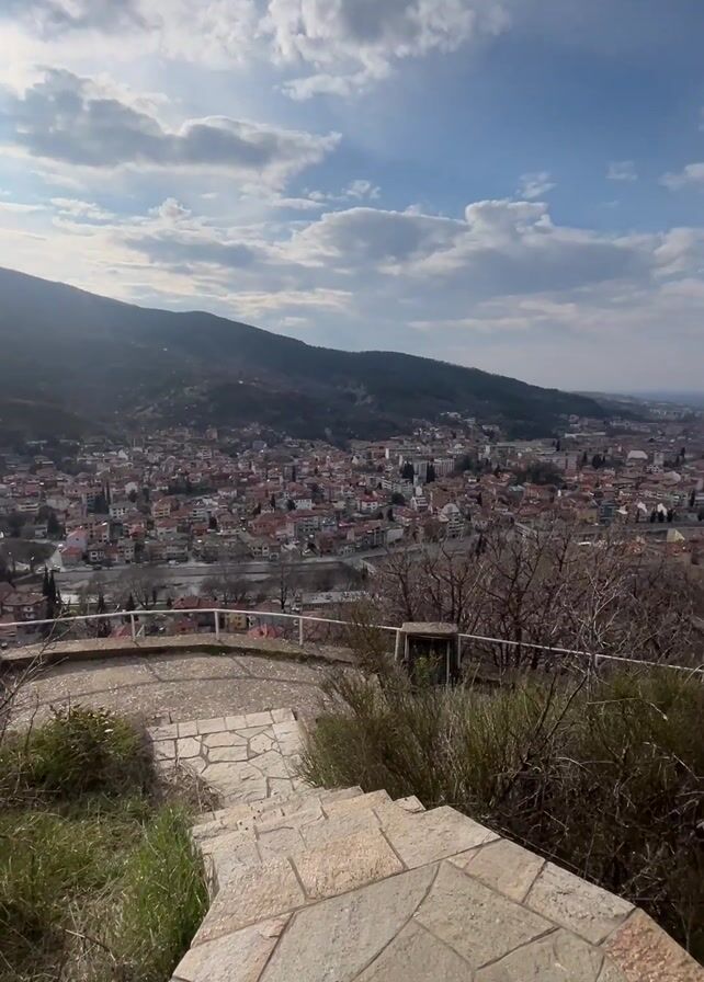 scenic overview of a town nestled amongst hills, taken from an elevated stone viewpoint with descending steps. The town consists of numerous buildings with red roofs, traversed by a river. The sky is partly cloudy, with bright sunlight breaking through. There's vegetation surrounding the viewpoint, including grass and shrubbery, along with some bare trees. Power lines are visible in the distance.