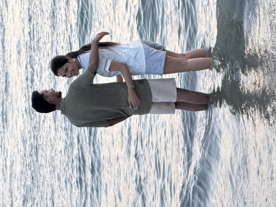 At Cenang Beach, Malaysia, two individuals are depicted standing in the shallow sea water, which reaches approximately mid-calf. The male, positioned on the left, is wearing a dark olive green short-sleeved collared shirt and light beige shorts. His left arm is extended around the female's waist, and he is looking towards her. The female, positioned on the right, is wearing a white short-sleeved t-shirt with thin horizontal stripes on the sleeves and light blue shorts. Her right arm is extended around the male's lower back/waist. She possesses dark hair, tied back in a ponytail, and is wearing white hoop earrings. The female is observed looking directly towards the viewer with a smile. The surrounding water exhibits gentle ripples, and the overall lighting is soft, suggesting either early morning or late afternoon. The background consists solely of open water, with no distant land visible.