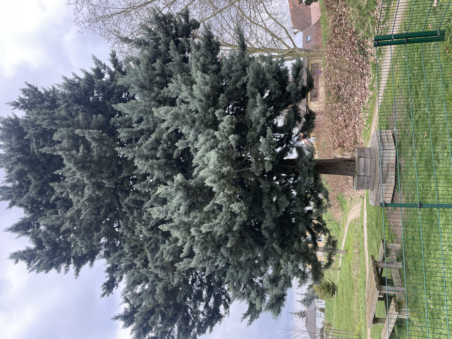 The image displays an outdoor park environment in Holtzheim, France, under an overcast sky. A prominent conifer tree, characterized by dense, blue-green foliage, occupies the central and upper portions of the frame, anchored by a thick brown trunk. A circular wooden bench structure, exhibiting signs of weathering, is built around the base of this central tree. In the left foreground, a weathered wooden picnic table with integrated benches is situated on mown green grass. A green metal mesh fence with posts spans across the lower midground, separating the immediate foreground grass from the area around the tree and path. A light-colored dirt path curves through the midground, passing adjacent to the tree and extending into the background. In the left background, a small white house with a dark roof and a smaller evergreen tree are visible on a grassy incline. The right background features an elevated slope densely covered with brown, dried leaves and bare deciduous shrubs, behind which residential buildings with tiled roofs are discernible. A leafless deciduous tree stands to the right of the main conifer. No individuals or active subjects are present within the scene.