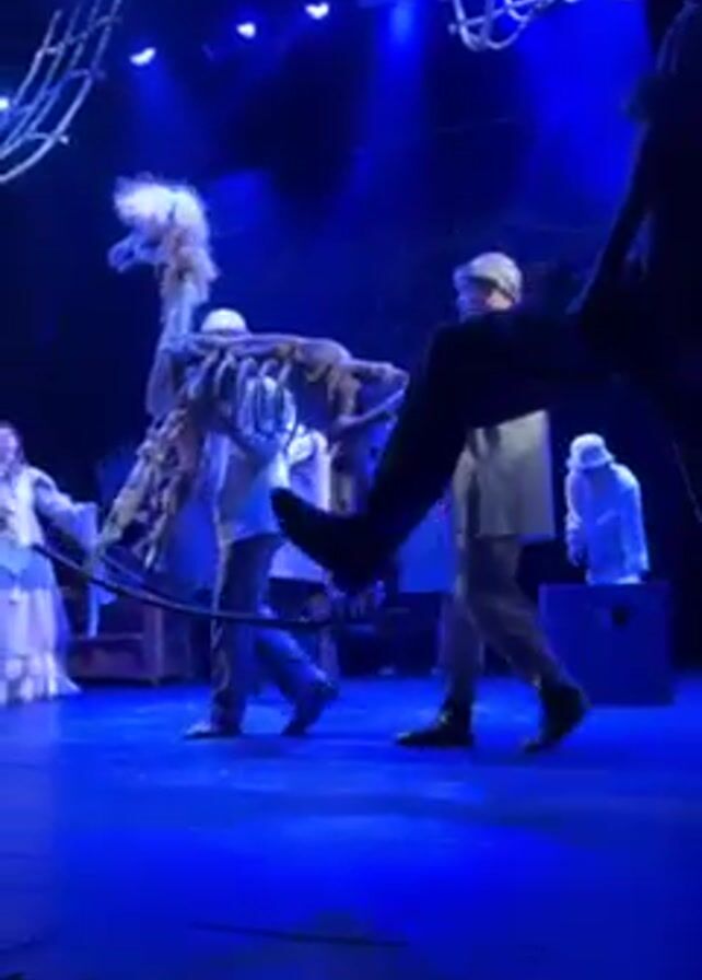 stage performance. The stage is lit with blue light and has a dark backdrop with a web-like structure suspended from the ceiling. On stage, there are several actors dressed in various costumes, including what appears to be a skeleton horse or similar puppet with someone inside operating it. Another actor in dark clothing walks in front of the horse and other actors, kicking his leg out to the side. The other actors are stationary and dressed in light-colored garments. One is wearing a white cap. A person recording from the side of the stage can be seen in the lower right corner of the frame.