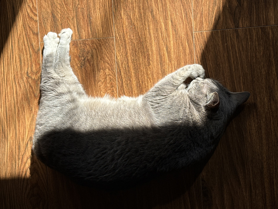 - "A domestic cat, exhibiting grey fur, rests on its left side on a wooden floor" by FM-HdjVs2, licensed under CC BY 4.0