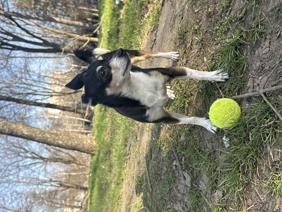 - "A small, tri-color dog, predominantly black with a white chest and tan markings on its face and legs, stands attentively on patchy grass and dirt" by FM-jbGTI3, licensed under CC BY 4.0